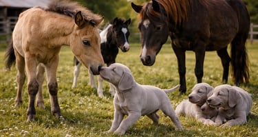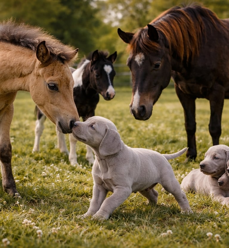 👉 la cohabitation maîtrisée entre Braques de Weimar et mini chevaux américains.